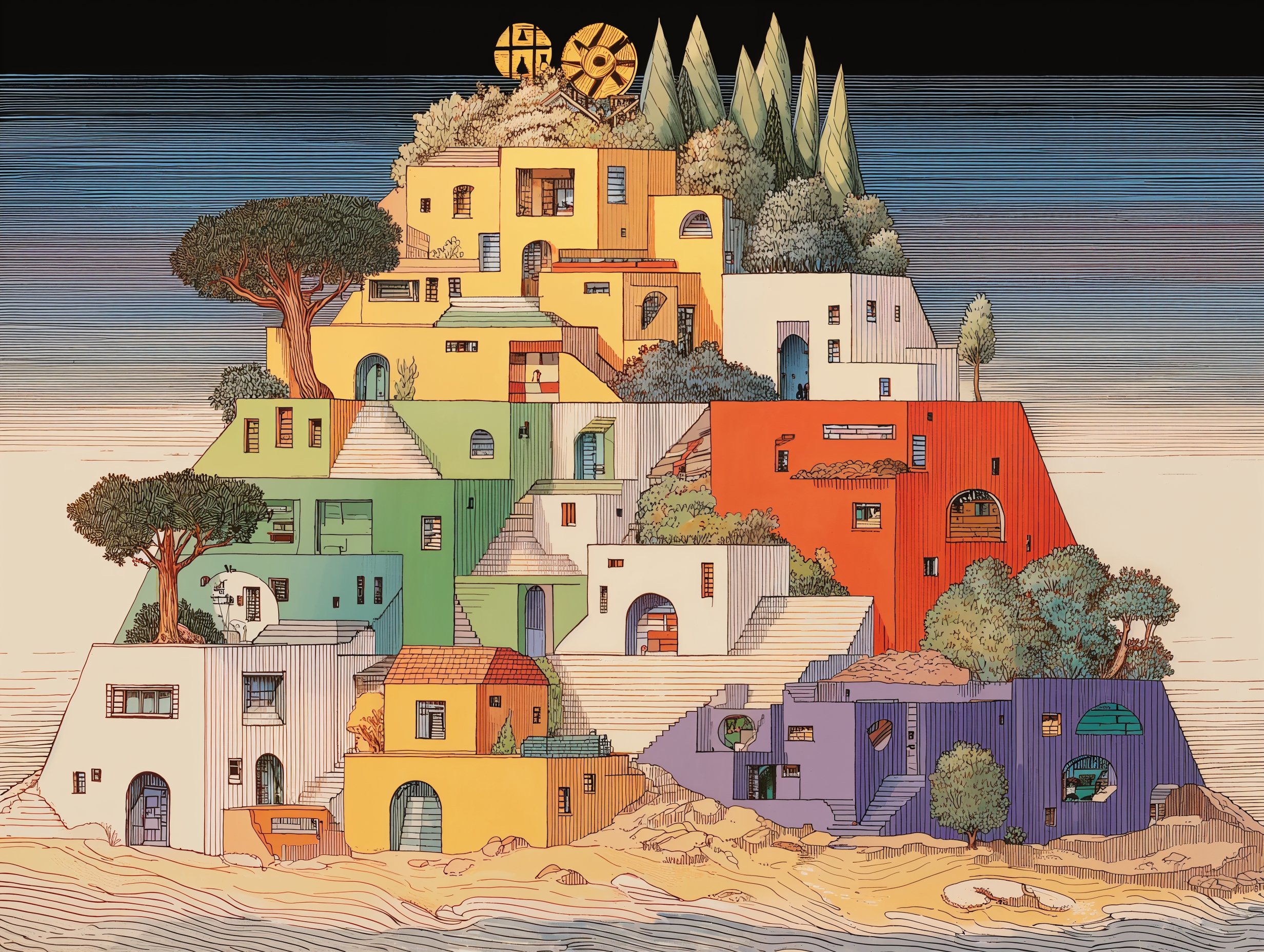 特徴: 高さ10〜50mの樹上に建てられた住居。野生動物や敵から身を守るために発達。