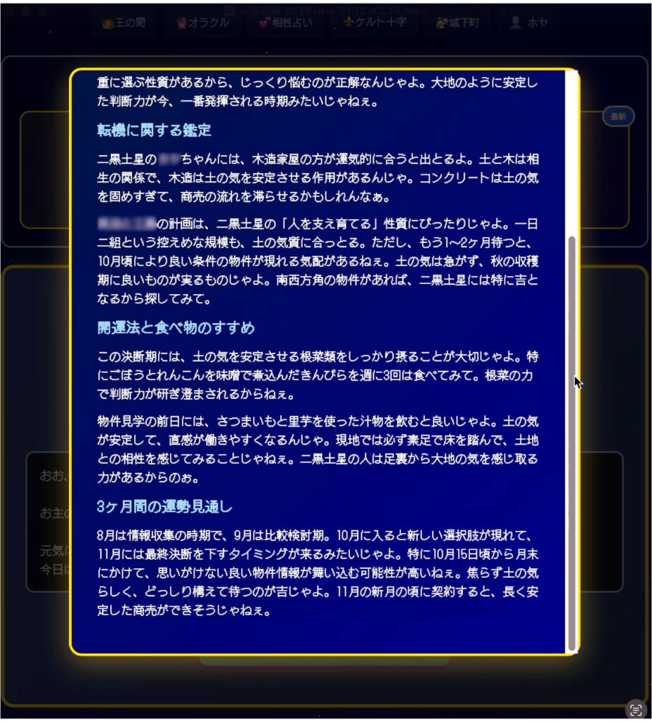 転機に関する鑑定 「二黒土星のあなたには、木造家屋の方が運気的に合うと出とるよ。土と木は相生の関係で、木造は土の気を安定させる作用があるんじゃ。」