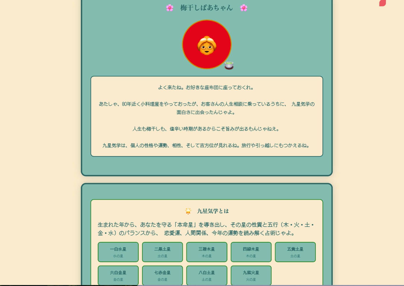 九星気学を得意とする梅干しばあちゃんが、あなたの本命星に基づいた丁寧なアドバイスをお届けします。